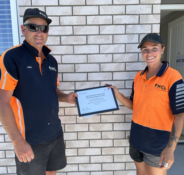 Sarah's employer James Bannister, presents her with her NZ Apprenticeship in Landscape Construction