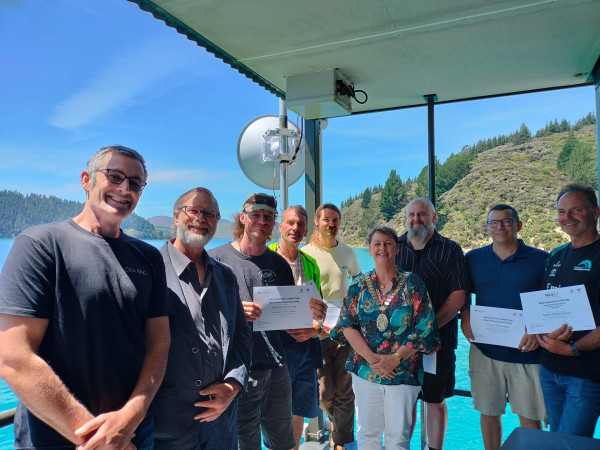 Marlborough Mayor Nadine Taylor joined the NZKS team at the company’s Te Pangu sea farm in Tory Channel last week, where she presented the new graduates with their certificates.
